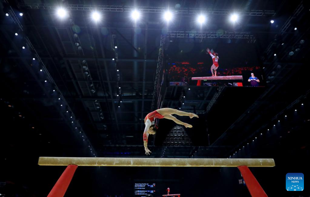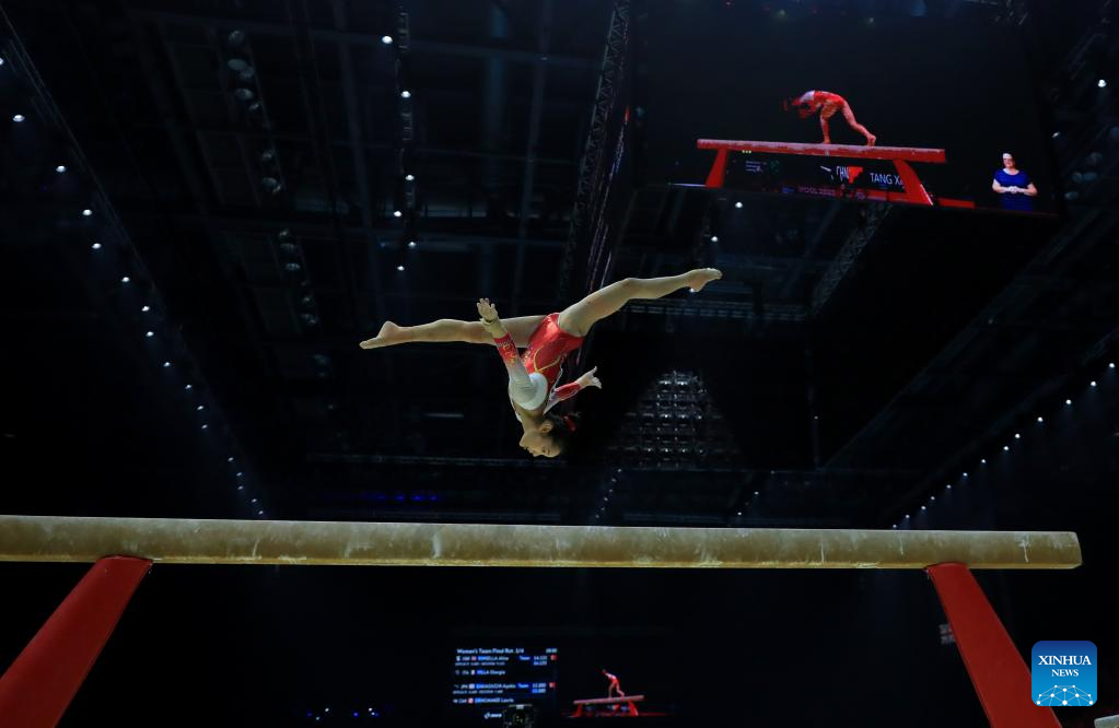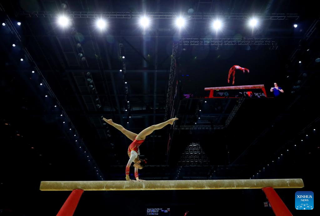 Tang Xijing of team China competes on the balance beam of the women's team final at the 51st FIG Artistic Gymnastics World Championships in Liverpool, Britain, Nov. 1, 2022. (Xinhua/Li Ying)