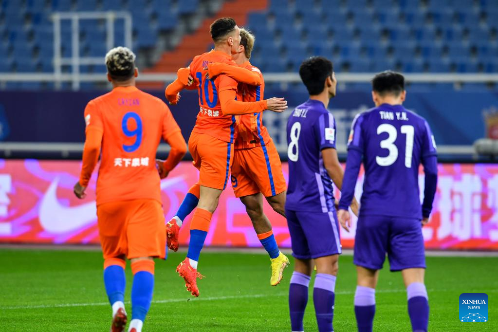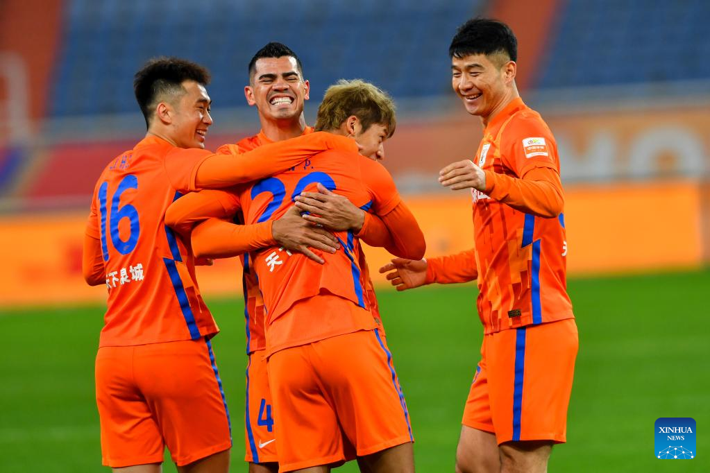 Chen Pu (3rd R) of Shandong Taishan celebrates scoring with his teammate Moises (2nd L) during a 2022 season Chinese Football Association Super League (CSL) match against Tianjin Jinmen Tigers in Jinan, capital of east China's Shandong Province, Nov. 3, 2022. (Xinhua/Zhu Zheng)
