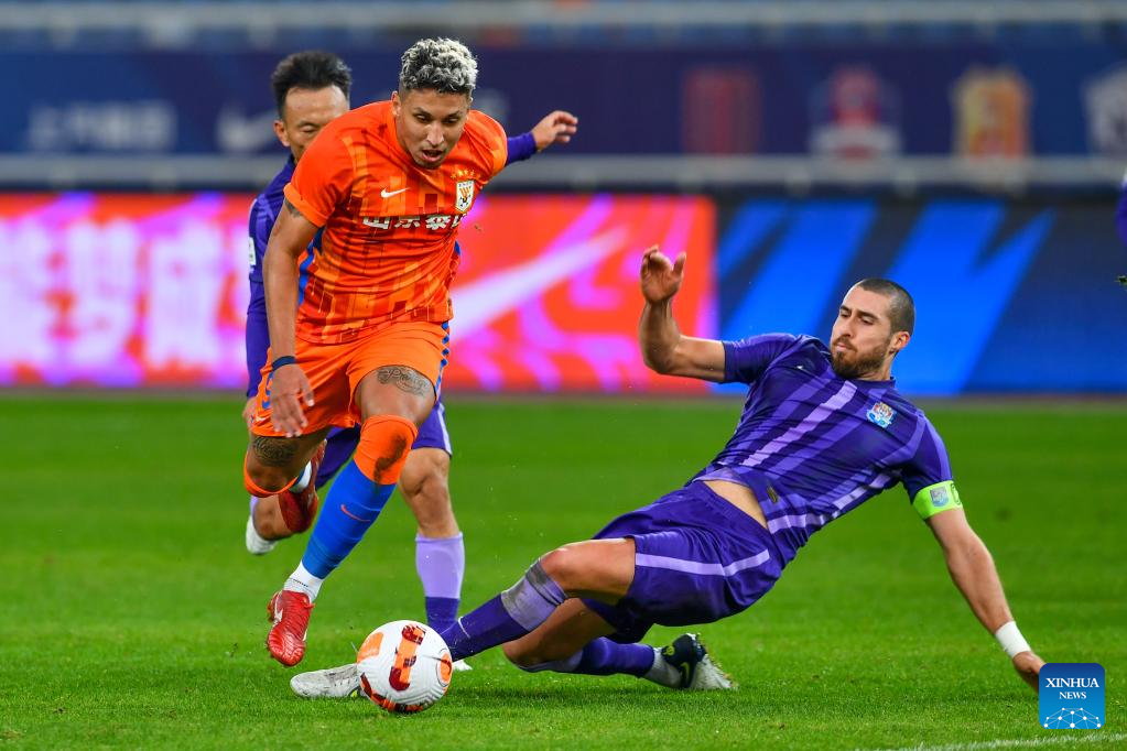 Moises (L) of Shandong Taishan vies with Yang Fan of Tianjin Jinmen Tigers during their 2022 season Chinese Football Association Super League (CSL) match in Jinan, capital of east China's Shandong Province, Nov. 3, 2022. (Xinhua/Zhu Zheng)