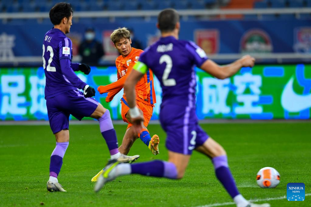 Chen Pu (C) of Shandong Taishan shoots during a 2022 season Chinese Football Association Super League (CSL) match against Tianjin Jinmen Tigers in Jinan, capital of east China's Shandong Province, Nov. 3, 2022. (Xinhua/Zhu Zheng)