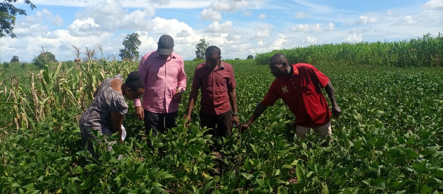 Members of the maize and soybean inter-planting project "Small Bean and Big Nutrition" work in a field in Morogoro, Tanzania, on April 21, 2022. (China Agricultural University/Handout via Xinhua)