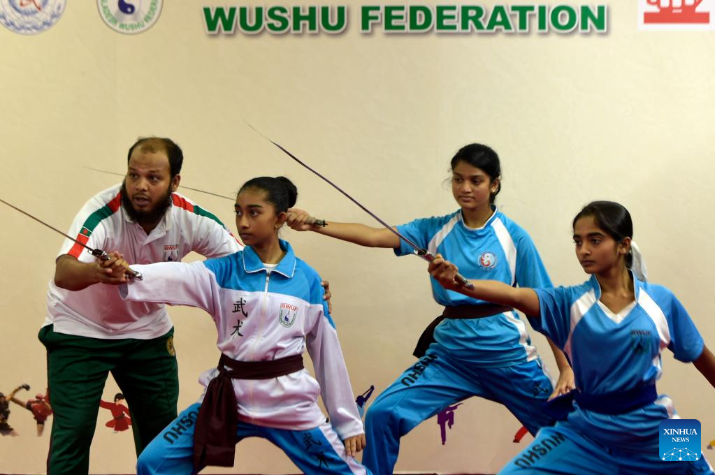 Students learn sword handling skills during a Wushu training session in Dhaka, Bangladesh on Oct. 27, 2022. Wushu has become a popular sport in Bangladesh, particularly among school girls who find the traditional Chinese martial art has a special appeal. (Xinhua)