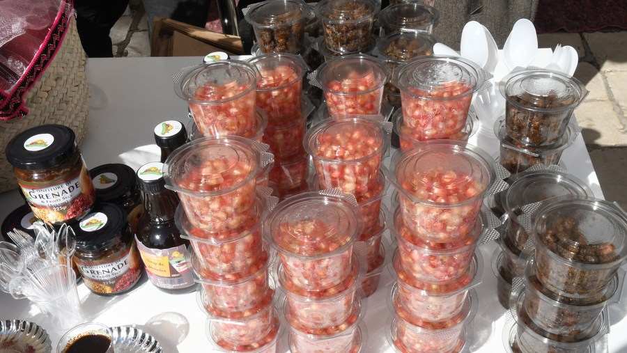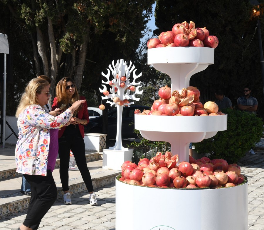 During the event, pomegranate farmers and food factories showcase their precious harvest and food made from pomegranates.