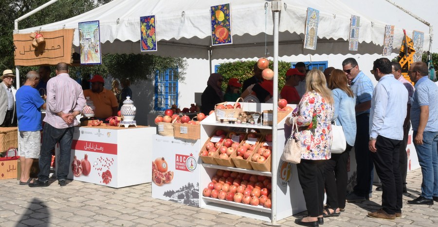 People look at pomegranates during a "pomegranate week" event showcasing harvested pomegranates and food made from pomegranates in Sidi Bou Said, north of Tunis, Tunisia on Nov. 1, 2022. (Photo by Adel Ezzine/Xinhua)
