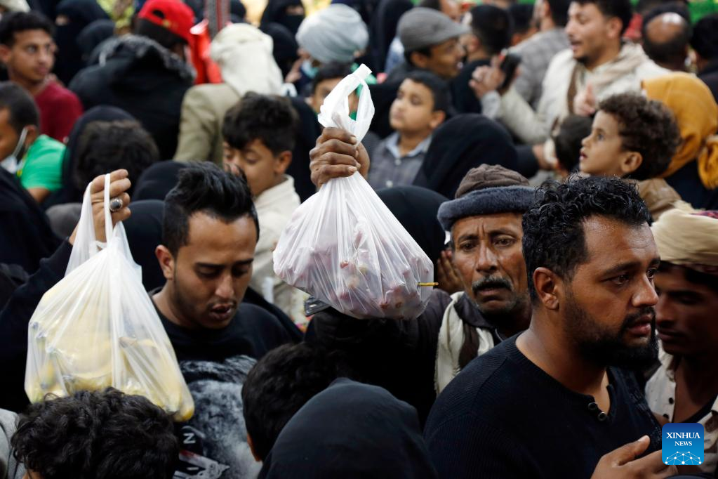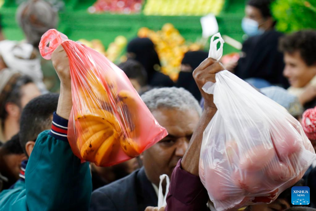Yemenis buy fruit and vegetables at a newly-opened charitable store that sells its goods at affordable prices in Sanaa, Yemen, on Nov. 2, 2022. (Photo by Mohammed Mohammed/Xinhua)