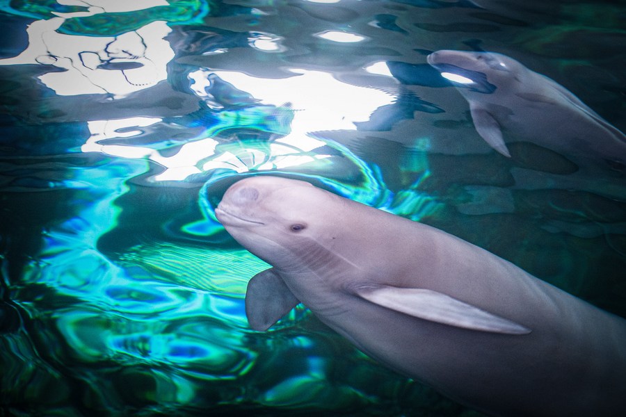 Yangtze finless porpoise F9C22 swims with its mother in the water at the Institute of Hydrobiology of Chinese Academy of Sciences in Wuhan, central China's Hubei Province, June 29, 2022. (Xinhua/Xiao Yijiu)