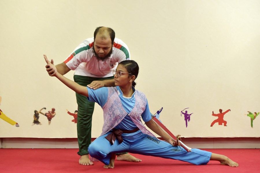 A student learns sword handling skills under the guidance of a trainer during a Wushu training session in Dhaka, Bangladesh on Oct. 27, 2022. (Xinhua)