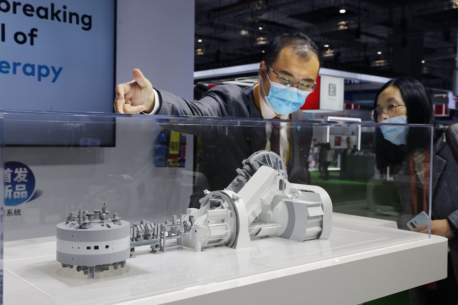 Varian Medical Systems, a U.S. leading company in radiotherapy, displays its proton therapy system during the third China International Import Expo (CIIE) in Shanghai, east China, Nov. 5, 2020. (Xinhua/Liu Ying)