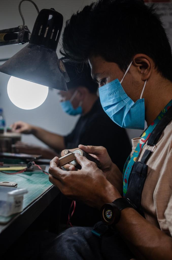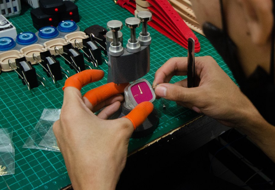 A worker sets up a wooden watch after finishing at Pala Nusantara workshop in Bandung, West Java, Indonesia. Nov. 3, 2022. (Photo by Septianjar Muharam/Xinhua) ■