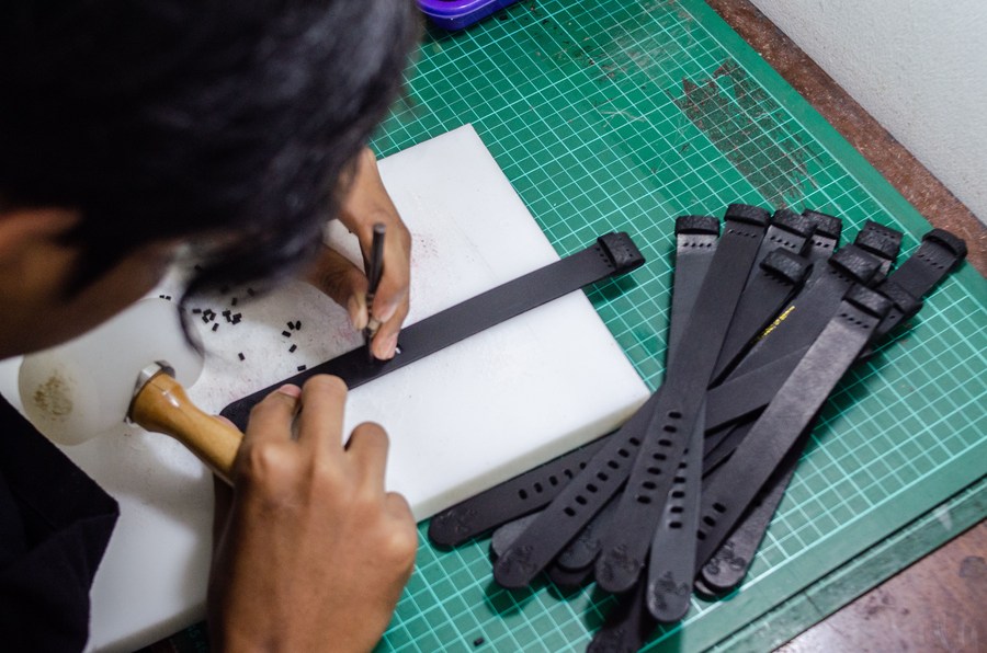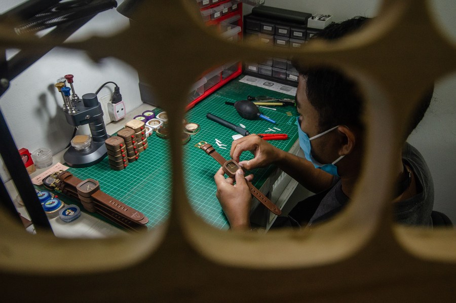 A worker prepares straps for wooden watches at Pala Nusantara workshop in Bandung, West Java, Indonesia. Nov. 3, 2022. (Photo by Septianjar Muharam/Xinhua)