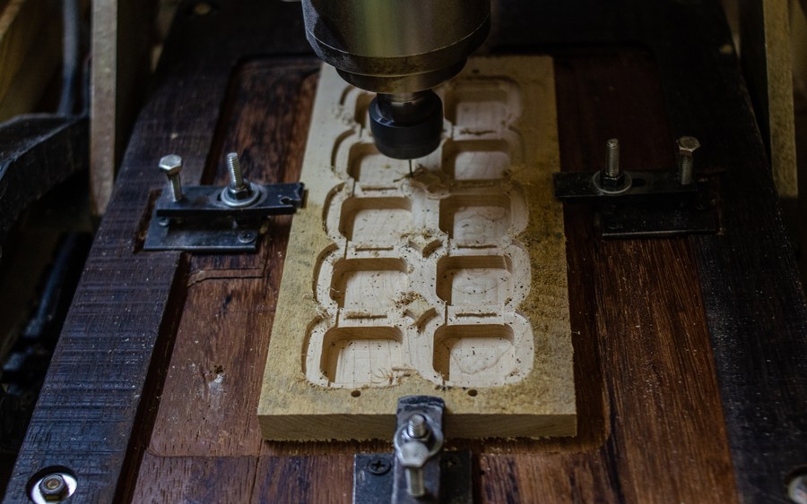 A machine making the pattern of wooden watch cases is seen at Pala Nusantara workshop in Bandung, West Java, Indonesia. Nov. 3, 2022. (Photo by Septianjar Muharam/Xinhua)