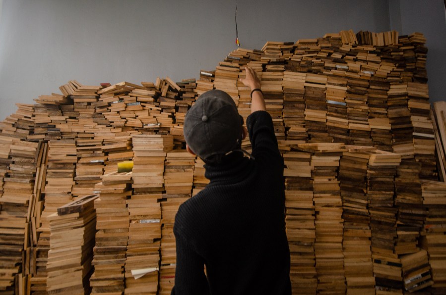 A worker picks some wood to make wooden watches at Pala Nusantara workshop in Bandung, West Java, Indonesia. Nov. 3, 2022. (Photo by Septianjar Muharam/Xinhua)