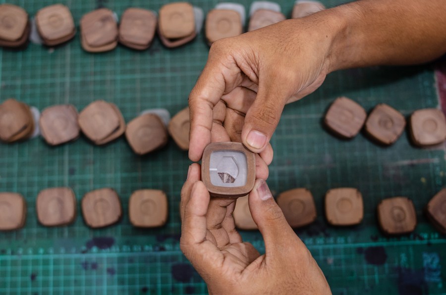 A worker holds a wooden watch case after finishing at Pala Nusantara workshop in Bandung, West Java, Indonesia. Nov. 3, 2022. (Photo by Septianjar Muharam/Xinhua)