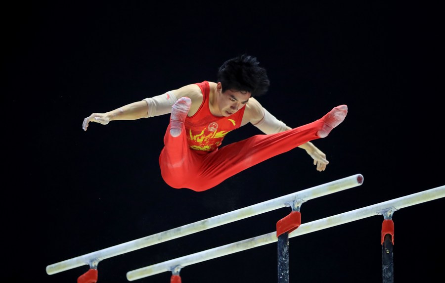 Zhang Boheng of China competes in parallel bars competition of the men's all-around final at the 51st FIG Artistic Gymnastics World Championships in Liverpool, Britain, Nov. 4, 2022. (Xinhua/Li Ying)