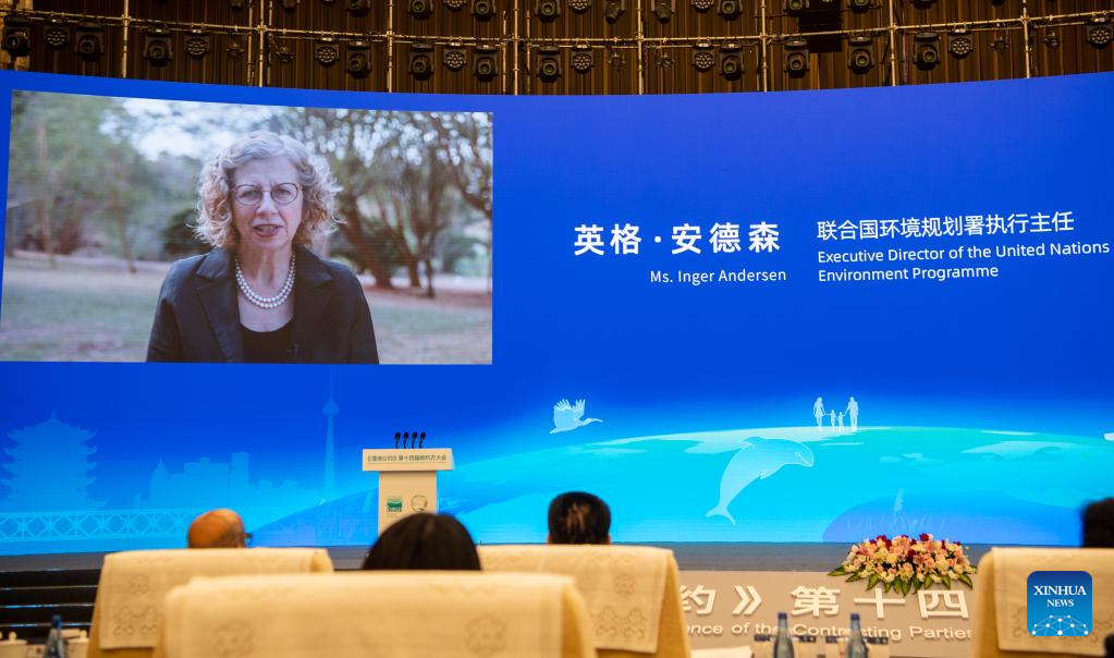 Inger Andersen, Executive Director of the United Nations Environment Programme, addresses via video link the opening ceremony of the 14th Meeting of the Conference of the Contracting Parties to the Ramsar Convention on Wetlands (COP14) held in Wuhan, central China's Hubei Province, Nov. 5, 2022. (Xinhua/Wu Zhizun)