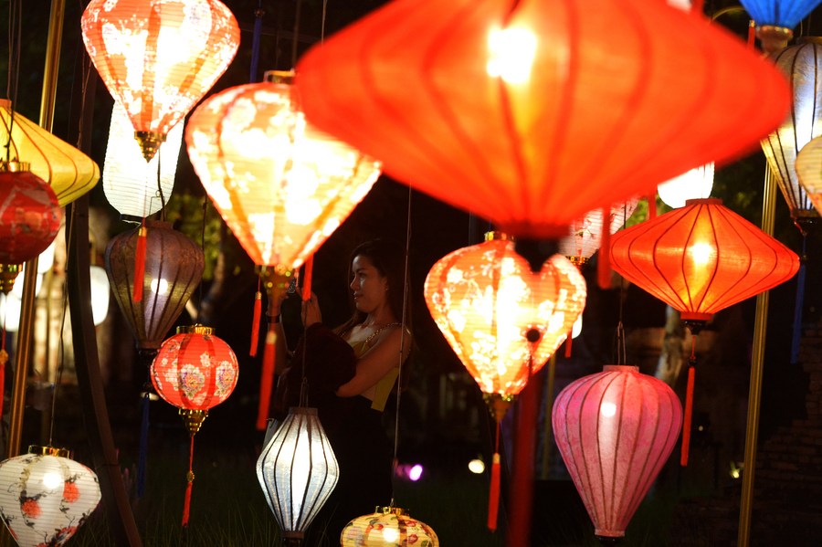 A woman takes photos at the Thailand International Lantern and Food Festival in Muangboran of Samut Prakan Province, Thailand, Nov. 4, 2022. (Xinhua/Rachen Sageamsak)