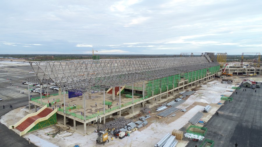 Aerial photo taken on April 3, 2022 shows the construction site of Chinese-invested Siem Reap Angkor International Airport in Sotr Nikum district, about 40 km from the UNESCO listed Angkor Archaeological Park and 50 km from Siem Reap provincial town, Cambodia. (Photo by Ly Lay/Xinhua)