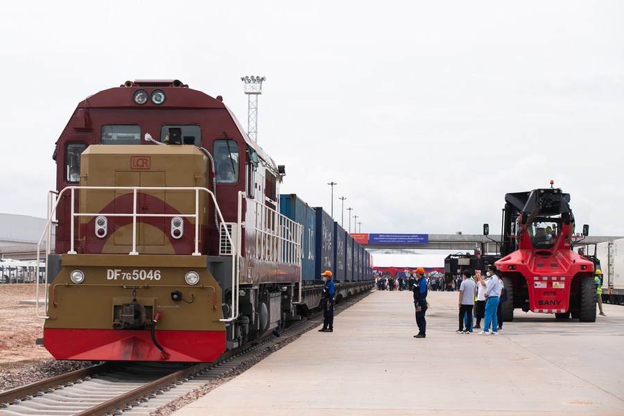 Cross-border goods are reloaded at a freight transit yard of China-Laos Railway's Vientiane South Station on July 1, 2022. (Photo by Kaikeo Saiyasane/Xinhua)