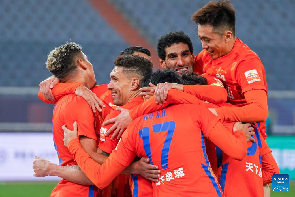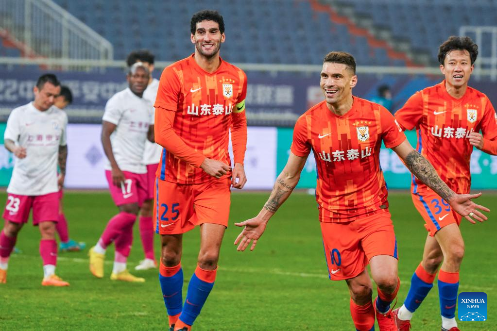 Moises (2nd R) of Shandong Taishan celebrates his goal during a 2022 season Chinese Football Association Super League (CSL) match against Shanghai Shenhua in Jinan, capital of east China's Shandong Province, Nov. 7, 2022. (Xinhua/Zhu Zheng)