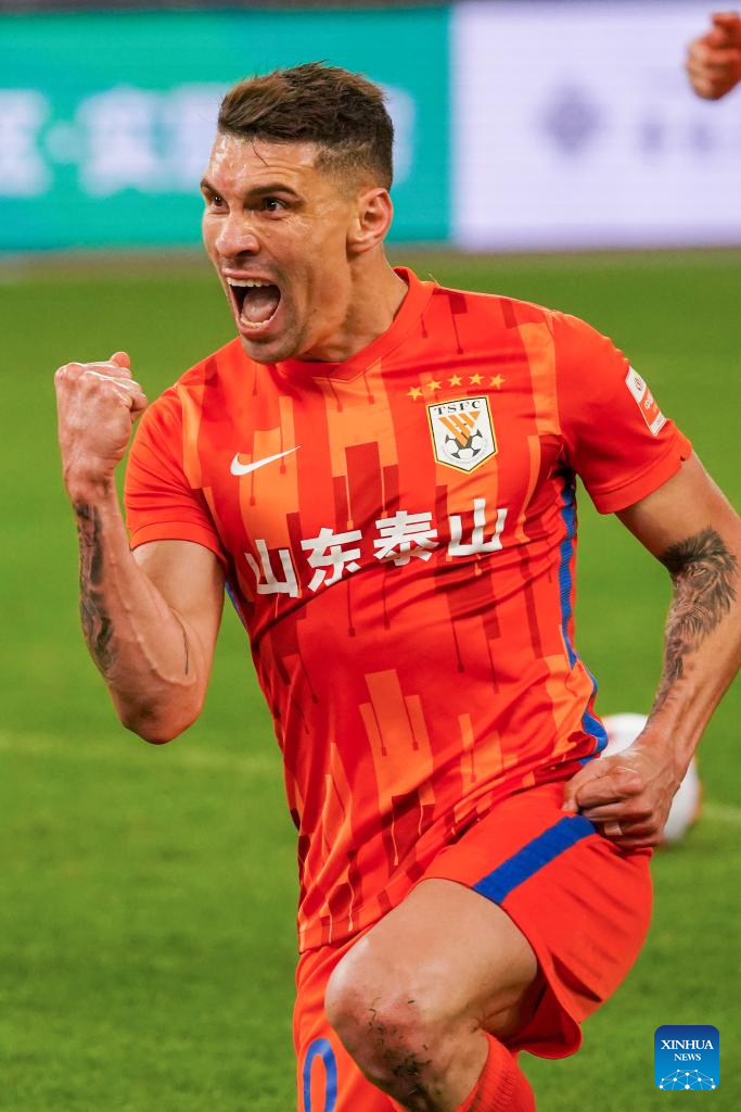 Moises of Shandong Taishan celebrates his goal during a 2022 season Chinese Football Association Super League (CSL) match against Shanghai Shenhua in Jinan, capital of east China's Shandong Province, Nov. 7, 2022. (Xinhua/Zhu Zheng)