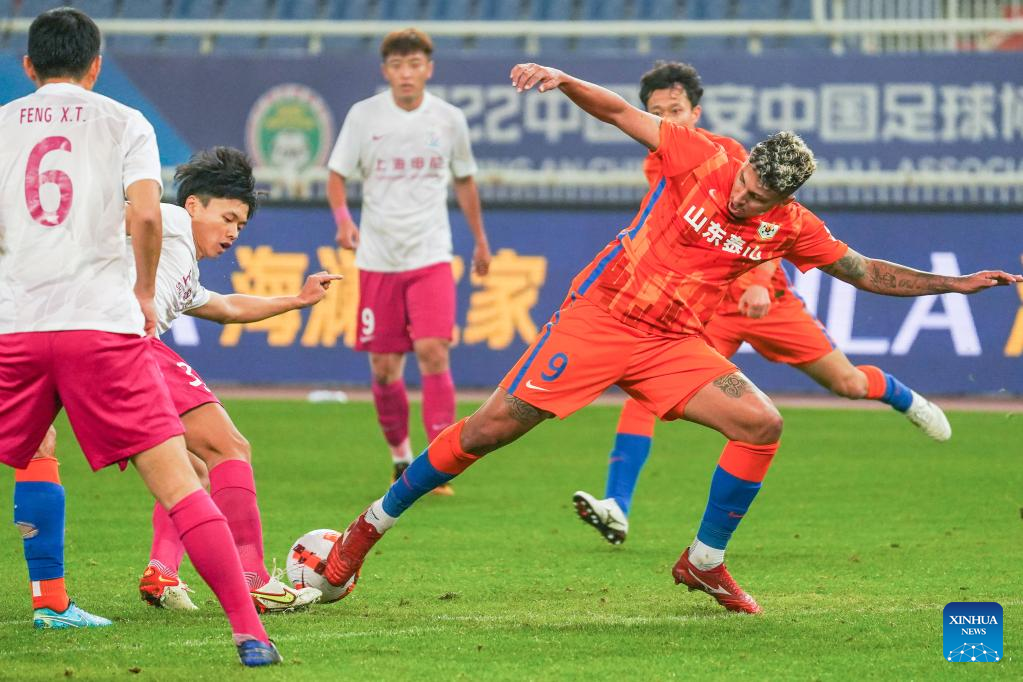 Crysan (front R) of Shandong Taishan competes during a 2022 season Chinese Football Association Super League (CSL) match against Shanghai Shenhua in Jinan, capital of east China's Shandong Province, Nov. 7, 2022. (Xinhua/Zhu Zheng)