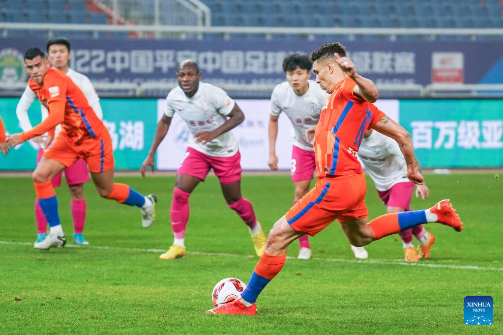 Moises (front) of Shandong Taishan scores the penalty kick during a 2022 season Chinese Football Association Super League (CSL) match against Shanghai Shenhua in Jinan, capital of east China's Shandong Province, Nov. 7, 2022. (Xinhua/Zhu Zheng)