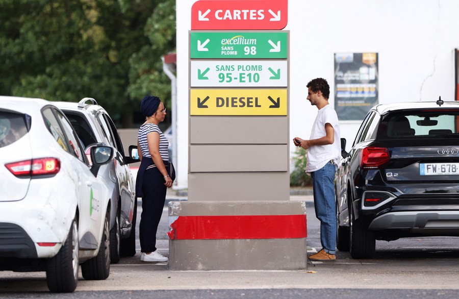 People fill the tanks of their cars at a gas station near Paris, France, Aug. 18, 2022. (Xinhua/Gao Jing)