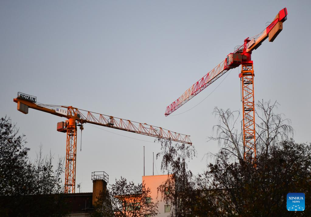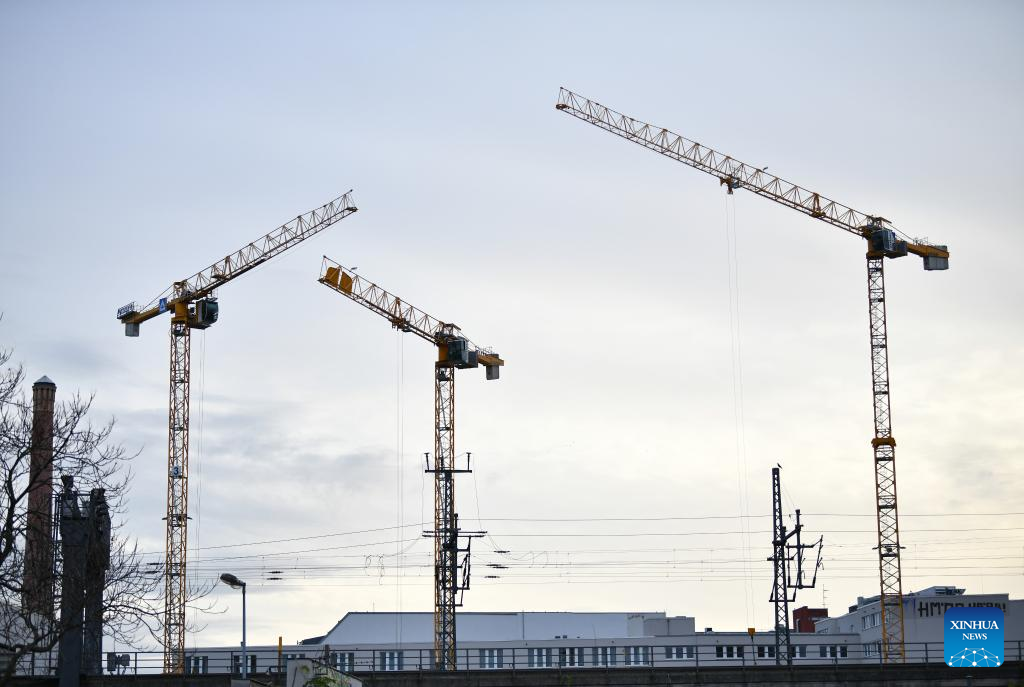 Photo taken on Nov. 7, 2022 shows tower cranes at a construction site in Berlin, Germany. Despite soaring energy prices and ongoing supply chain issues, industrial production in Germany in September increased by 0.6 percent month-on-month, the Federal Statistical Office (Destatis) said on Monday. (Xinhua/Ren Pengfei)