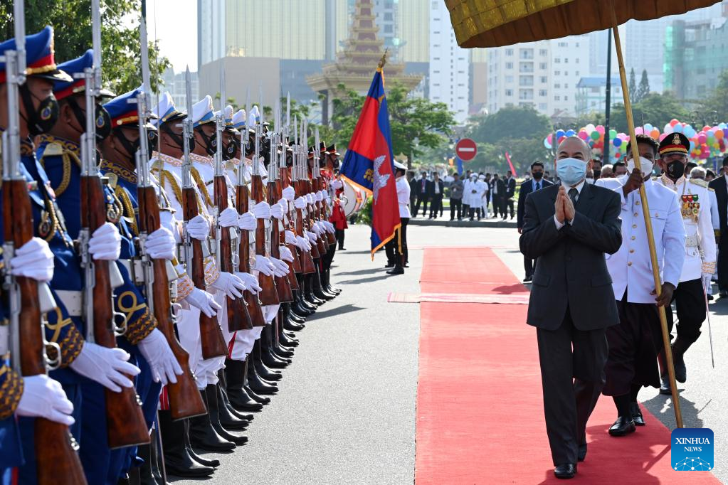 Cambodian King Norodom Sihamoni inspects the guard of honor during the Independence Day celebration in Phnom Penh, Cambodia, Nov. 9, 2022. Cambodia on Wednesday celebrated the 69th anniversary of its independence from France in an hour-long ceremony held at the Independence Monument here in the capital. (Photo by Ly Lay/Xinhua)