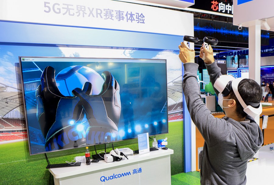 A visitor experiences the extended reality (XR) technology at the booth of Qualcomm during the fifth China International Import Expo (CIIE) in east China's Shanghai, Nov. 7, 2022. (Xinhua/Li Jing)