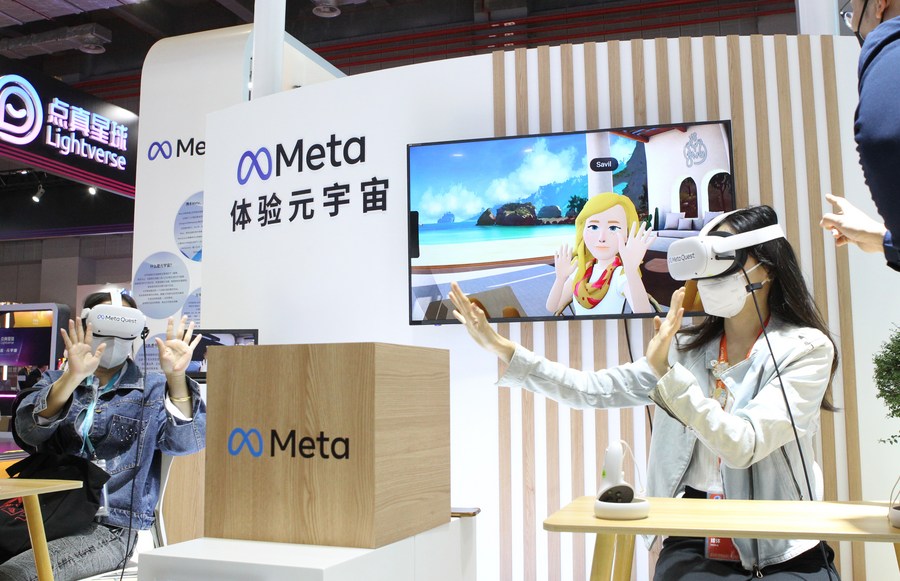 Visitors experience virtual reality (VR) devices at the Intelligent Industry & Information Technology exhibition area of the fifth China International Import Expo (CIIE) in east China's Shanghai, Nov. 7, 2022. (Xinhua/Hou Jun)