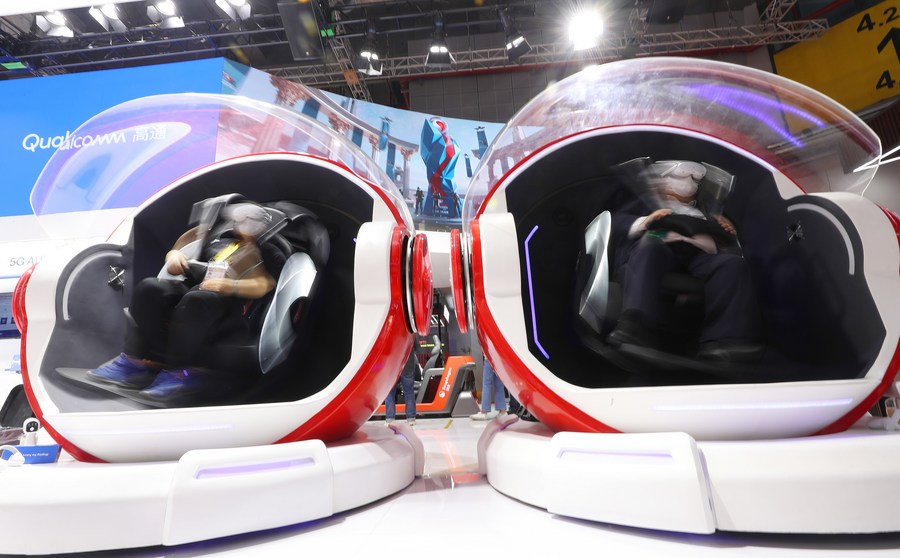 Visitors experience VR gaming capsules at the Intelligent Industry & Information Technology exhibition area of the fifth China International Import Expo (CIIE) in east China's Shanghai, Nov. 5, 2022. (Xinhua/Fang Zhe)