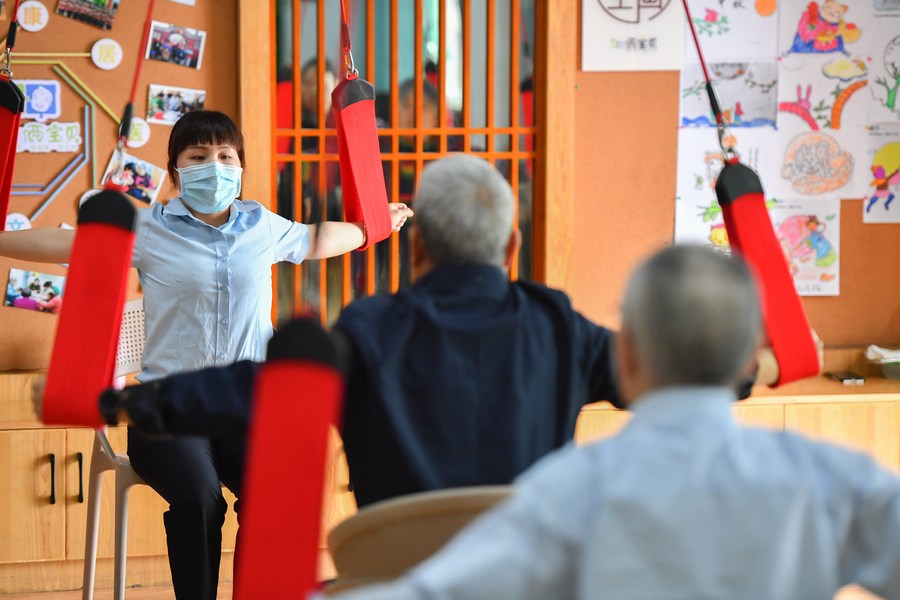 Liu Meng (L) takes the elderly for rehabilitation training at an elderly care service center in Yuhu District of Xiangtan City, central China's Hunan Province, May 17, 2022. (Xinhua/Chen Zeguo)