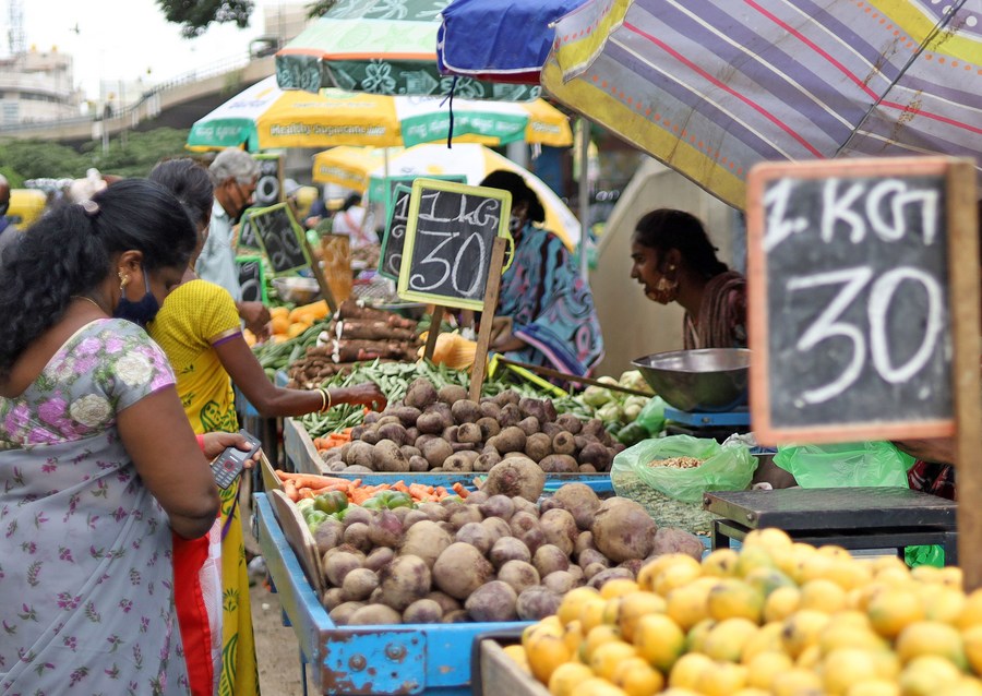 Vendors resume business as the COVID-19 restrictions ease at one of the oldest market in Bangalore, India, July 16, 2021. (Str/Xinhua)