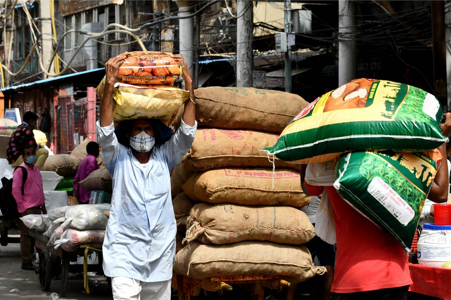Laborers carry items in Delhi, India, on June 9, 2021, as the local wholesale business reopened amid easing COVID-19 restrictions. (Xinhua/Partha Sarkar)