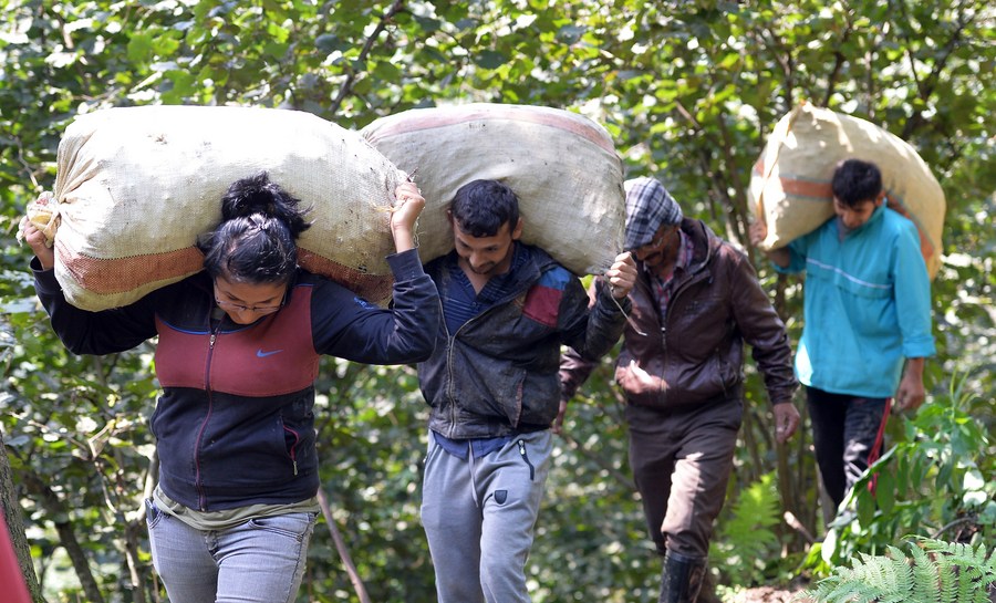 People harvest hazelnuts in Giresun, Türkiye, Nov. 8, 2022. (Photo by Mustafa Kaya/Xinhua)