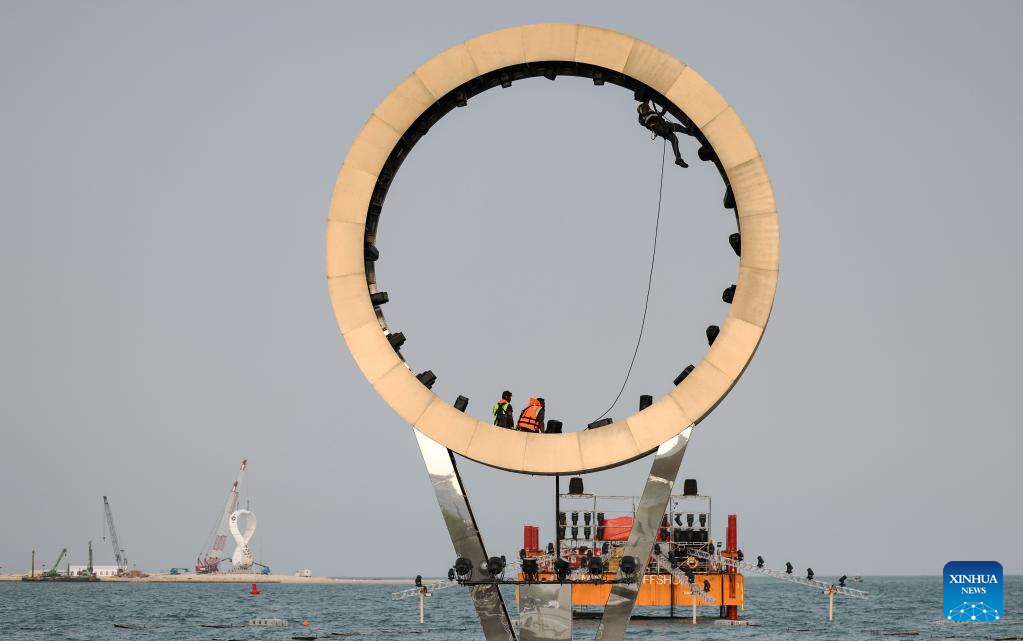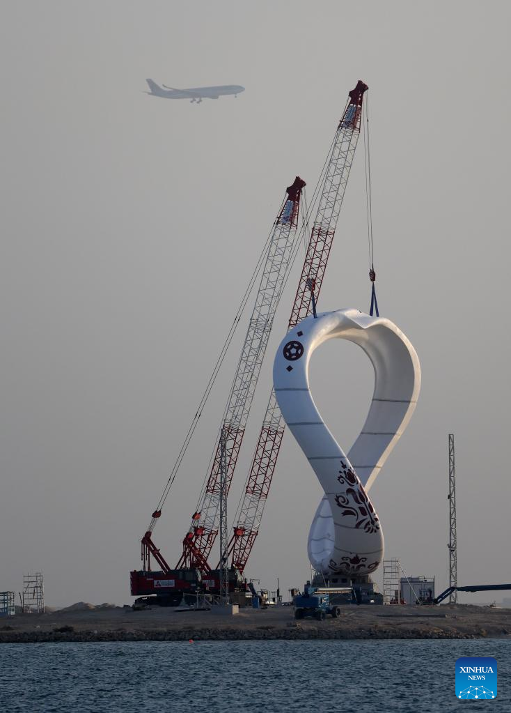 Workers work with FIFA World Cup Qatar 2022 installations at Doha Corniche in Doha, Qatar, on Nov. 8, 2022. (Xinhua/Li Ming)