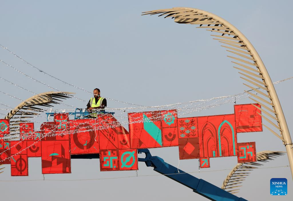 A worker puts on the FIFA World Cup 2022 decorations at the Doha Corniche with in Doha, Qatar, on Nov. 11, 2022. (Xinhua/Jia Haocheng)