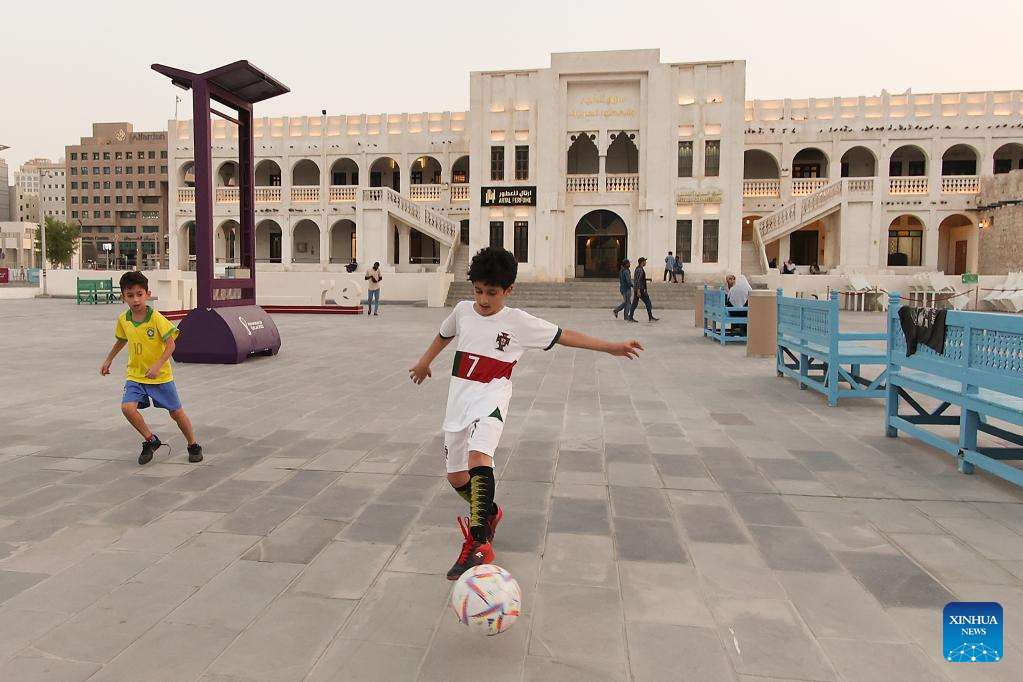 Boys play football at Souq Waqif in Doha, Qatar, on Nov. 8, 2022. (Xinhua/Xu Zijian)