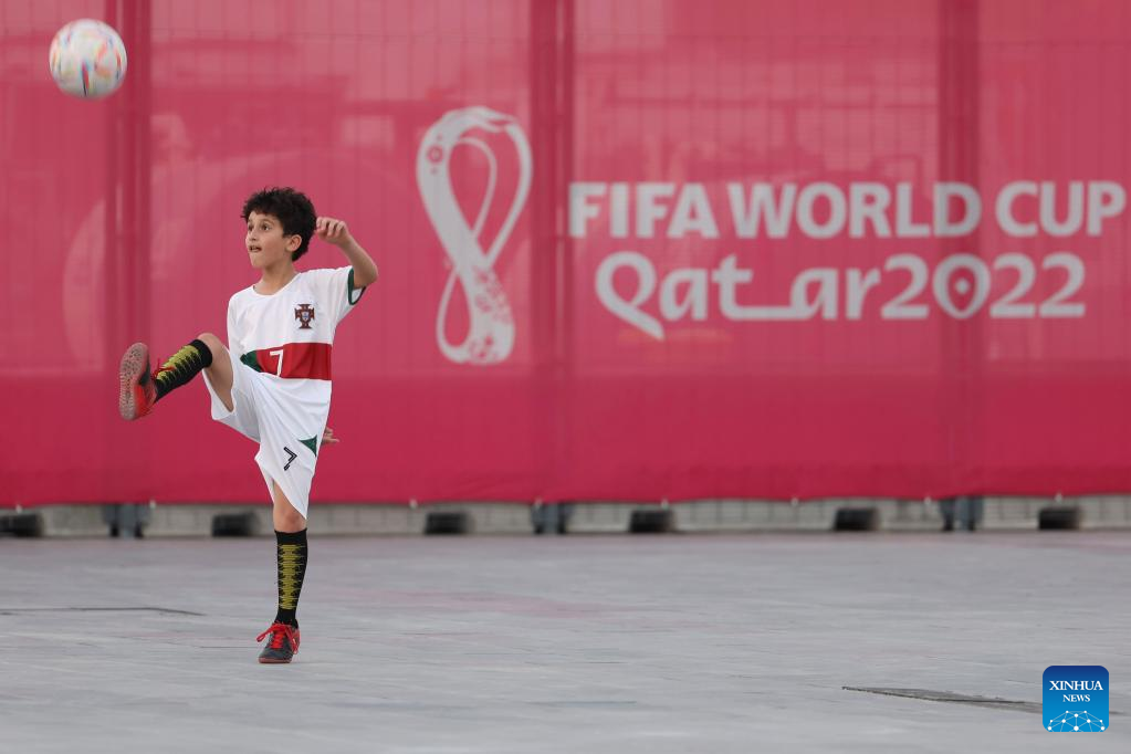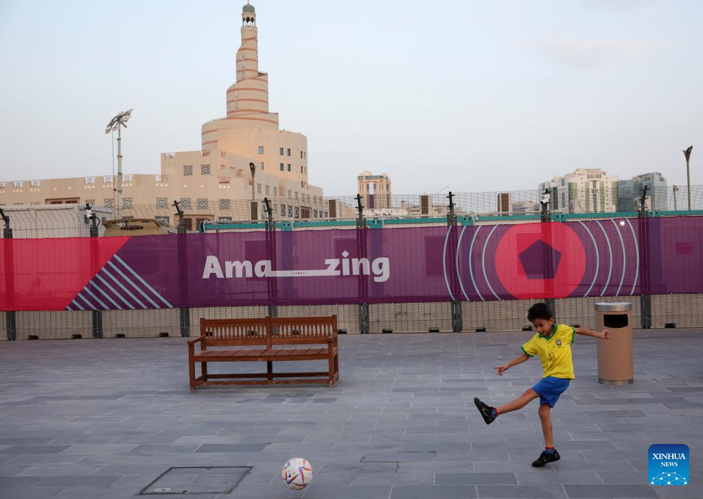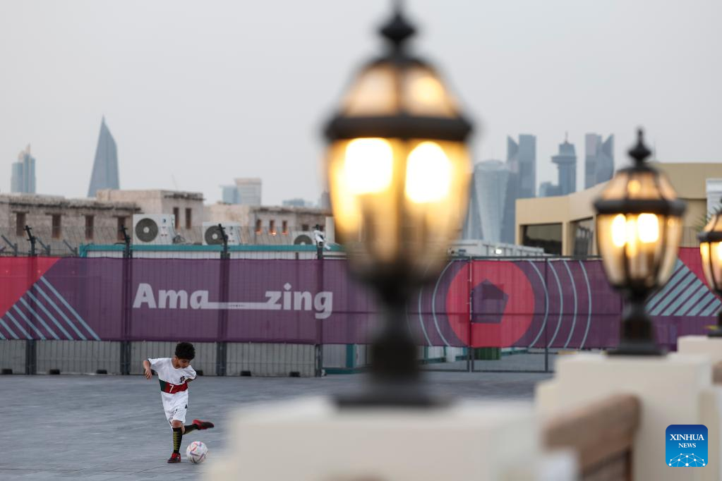 A boy plays football at the Souq Waqif in Doha, Qatar, on Nov. 8, 2022. (Xinhua/Jia Haocheng)