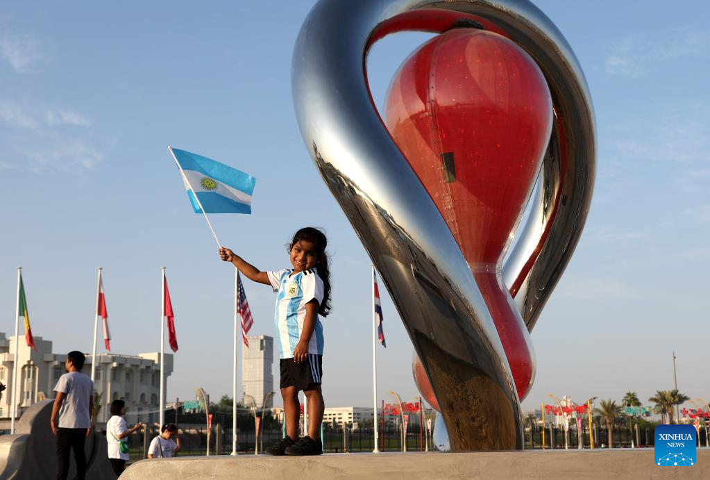 Photo taken on Nov. 10, 2022 shows a FIFA World Cup 2022 installation near the Doha Corniche in Doha, Qatar. (Xinhua/Jia Haocheng)