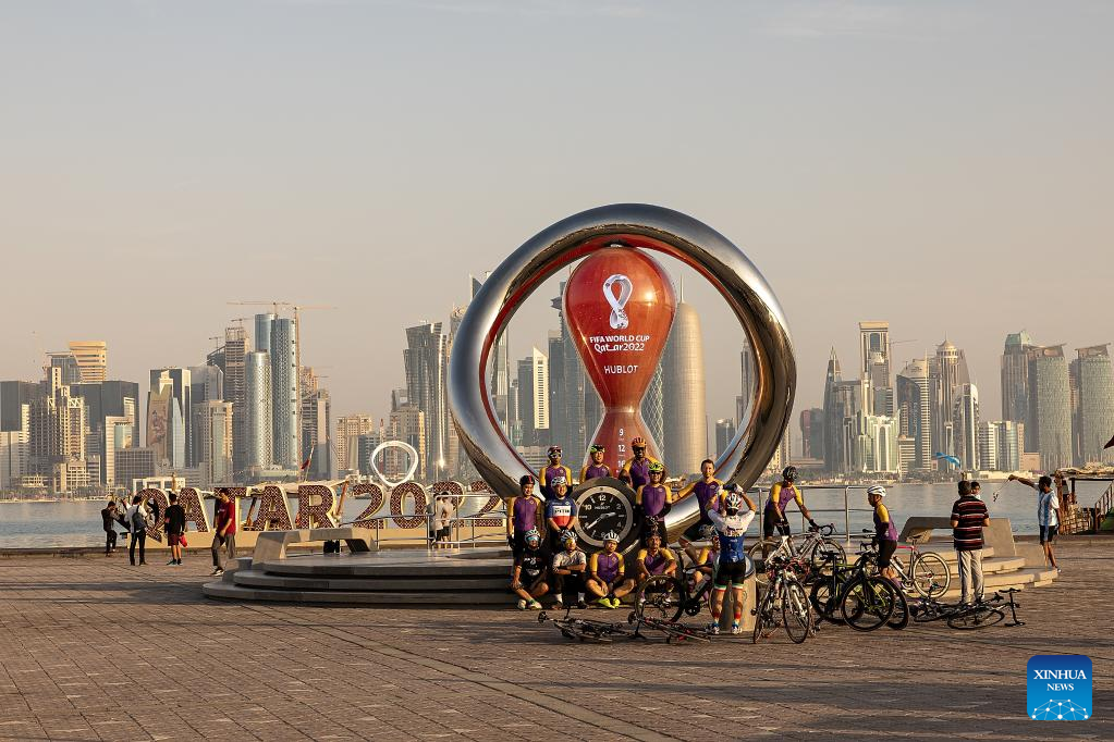 People take photos with the FIFA World Cup 2022 installations near the Doha Corniche in Doha, Qatar, on Nov. 11, 2022. (Xinhua/Xu Zijian)