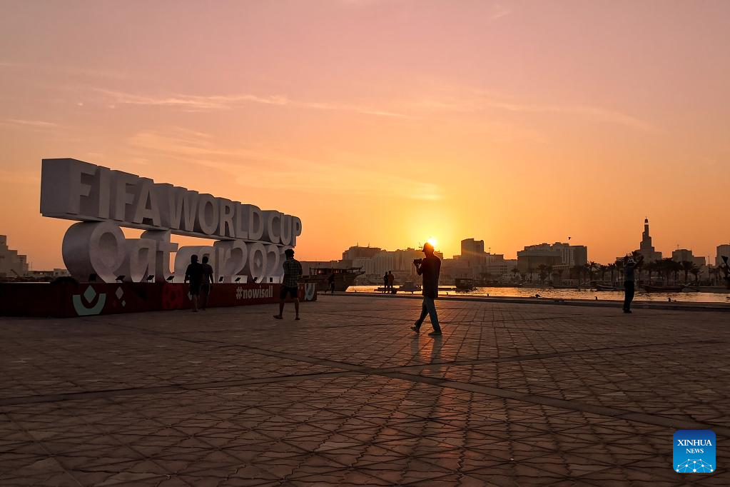 Pedestrians walk on the Doha Corniche with FIFA World Cup 2022 decorations in Doha, Qatar, on Nov. 11, 2022. (Xinhua/Xu Zijian)