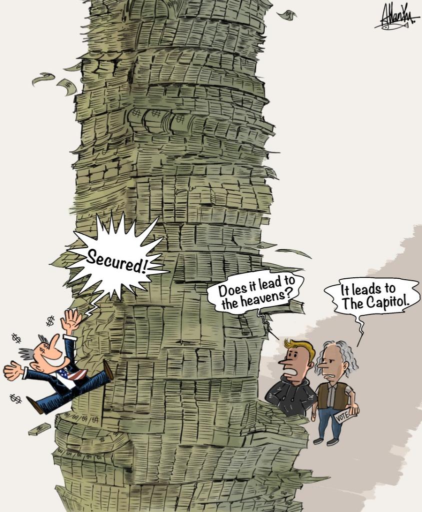 The U.S. 2022 midterm elections are expected to cost over $16.7 billion, according to OpenSecrets, making them the most expensive midterms ever. (Cartoon by Allan Yu/Xinhua)