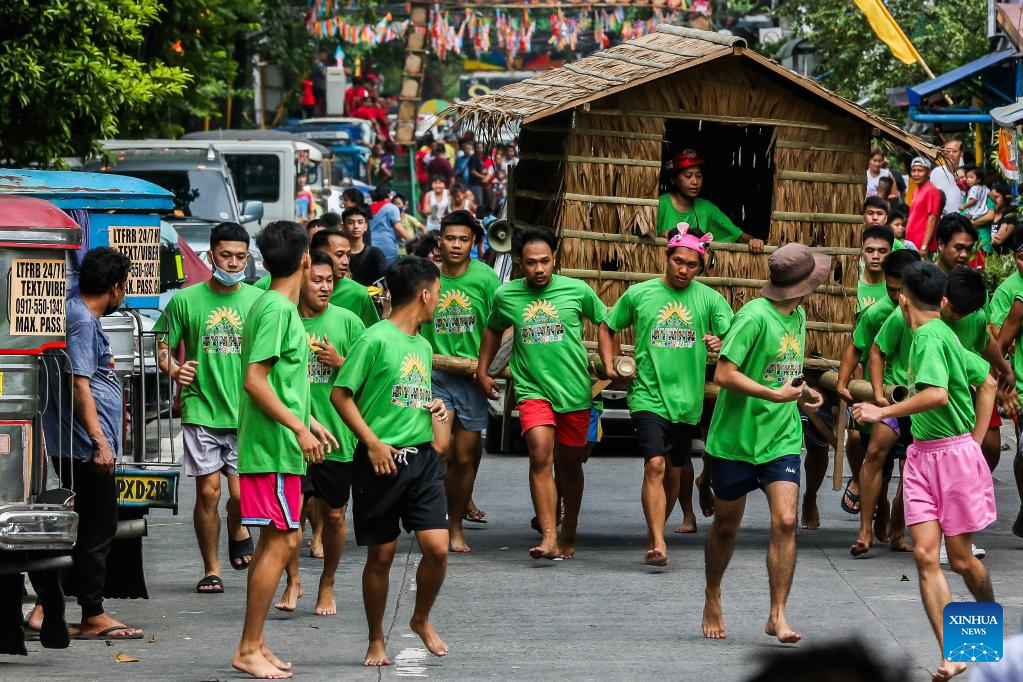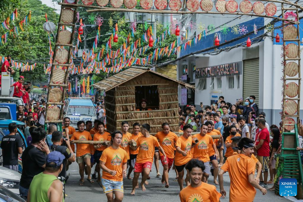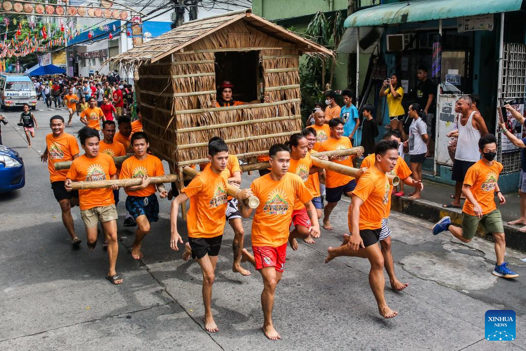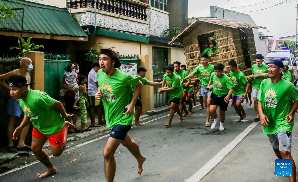 Residents run while carrying a hut made out of nipa palm during the Buhat Kubo (nipa hut carrying) race in Pasig City, the Philippines, Nov. 12, 2022. (Xinhua/Rouelle Umali)