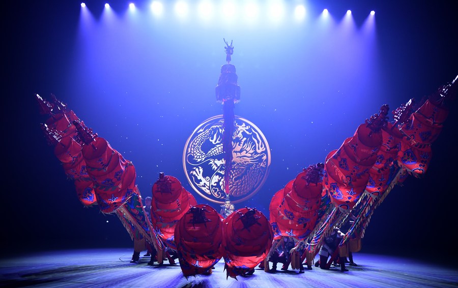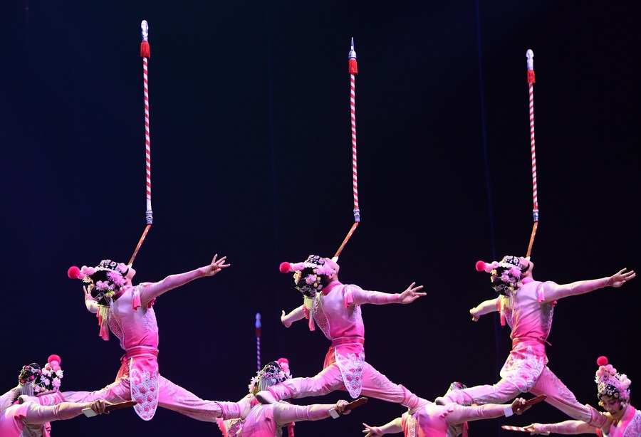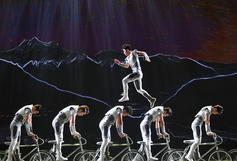 Artists perform during the 11th China Acrobatics Golden Chrysanthemum Awards Competition held in Puyang, central China's Henan Province, Nov. 9, 2022. (Xinhua/Li Jianan)