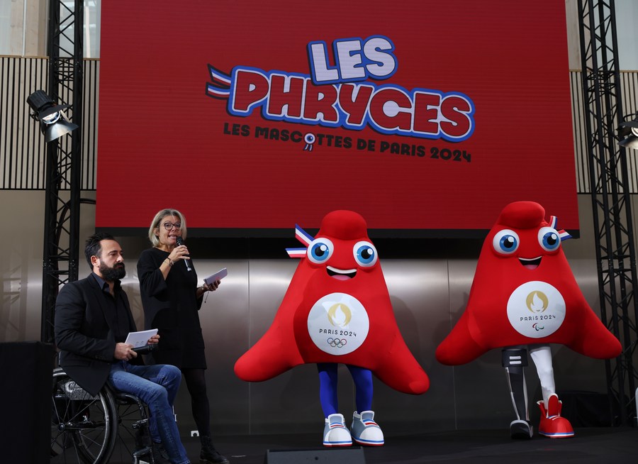 The Phryges, official mascots of the Paris 2024 Olympic and Paralympic Games, were unveiled at a press conference held in Paris on Nov. 14, 2022. (Xinhua/Gao Jing)