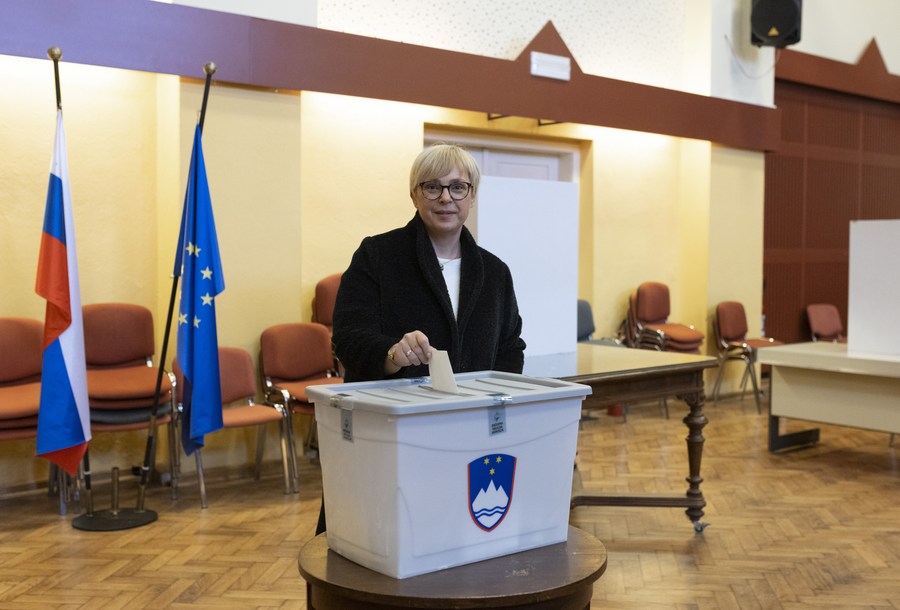 Presidential candidate Natasa Pirc Musar casts ballot during the presidential election at a polling station in Radomlje, Slovenia, Oct. 23, 2022. (Photo by Zeljko Stevanic/Xinhua)