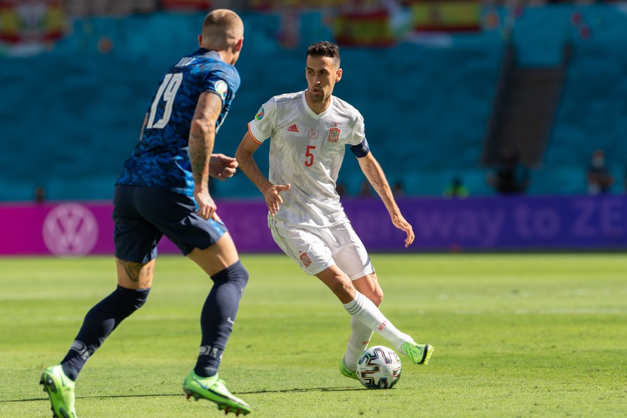 Spain's Sergio Busquets (R) vies with Slovakia's Juraj Kucka during a Group E match at the UEFA Euro 2020 in Seville, Spain on June 23, 2021. (Xinhua/Meng Dingbo)