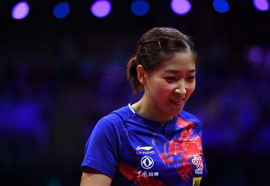 Liu Shiwen of China reacts during the women's singles final match against her teammate Chen Meng at 2019 ITTF World Table Tennis Championships in Budapest, Hungary on April 27, 2019. (Xinhua/Lu Yang)